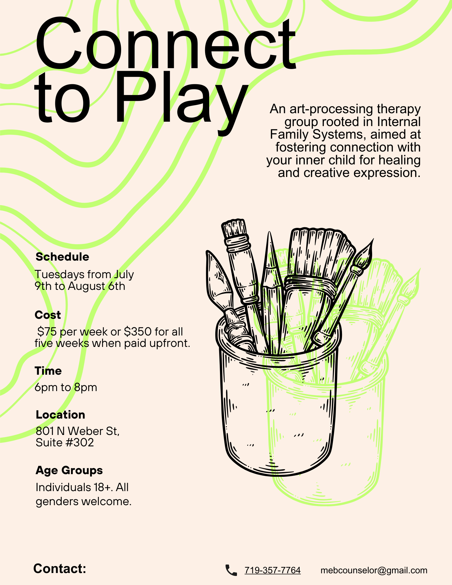 Join "Connect to Play": an intimate art processing group rooted in Internal Family Systems therapy, aimed at fostering connection with your inner child for healing and creative expression. In this space, you'll find permission, materials, and gentle guidance to unleash your inner child in a supportive environment.